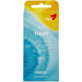 RFSU Tight on kondomi, jolla on tiukka istuvuus. Suora muoto tekee niiden rullaamisesta helpompaa. Värittömässä, suorassa lateksikondomissa on sileä pinta, säiliö ja liukuvoide. Leveys 49 mm, pituus 175 mm.