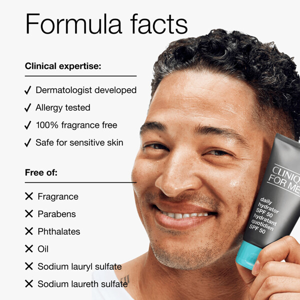 Clinique For Men Daily Hydrator SPF 50 on kevyt ja nopeasti imeytyvä kosteusvoide miehille, joka kosteuttaa ihoa välittömästi samalla kun se tarjoaa korkean aurinkosuojan SPF 50. Monitoiminen koostumus suojaa ihoa haitallisilta UVA- ja UVB-säteiltä ja auttaa ehkäisemään auringon aiheuttamia vaurioita ja varhaisia ikääntymisen merkkejä.