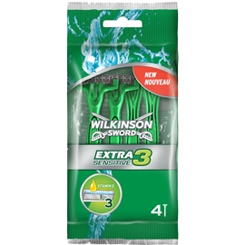 Wilkinson Sword Extra 3 Sensitive - Disposable Razorissa on 3 joustavaa, korkealuokkaista terää ja liikkuva pää, sen ansiosta on karvanpoisto tarkkaa ja mukavaa. 2 pehmentävää, E-vitamiinia sisältävää liuskaa, ne pehmentävät ja edesauttavat höylän joustavaa liikkumista. Kevytrakenteinen varsi on suunniteltu miehille antamaan parasta mukavuutta ja tarkkuutta. Käytännöllinen suojus pitää terät turvassa ja puhtaina ollessasi liikenteessä.