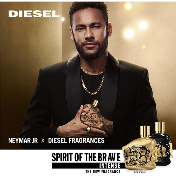 Tämä uusi Diesel-miestentuoksu symbolisoi uutta rohkeuden ja maskuliinisuuden muotoa. SPIRIT OF THE BRAVE INTENSE antaa sinun hoitaa haasteet ja vastoinkäymiset positiivisella ja optimistisella tavalla. Ensimmäistä kertaa on tämä ikoninen Diesel-pullo täysin kultaisena, menestyksen ja eleganssin symbolina. Pullossa on myös Neymar Jr'n ikoninen musta leijontatuointi, heijastaen voimaa.