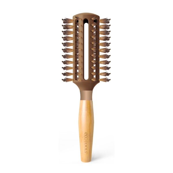 Full Volume Styler Large Round Hairbrush Ecotoolsilta on bambuvartinen hiusharja, jonka harjaosa on taklonia ja EVA-muovia ja se on pakattu kierrätettyyn paperiin. Ilmava muotoilu kuivattaa hiukset nopeammin ja vähentää lämmön aiheuttamaa kulumista.