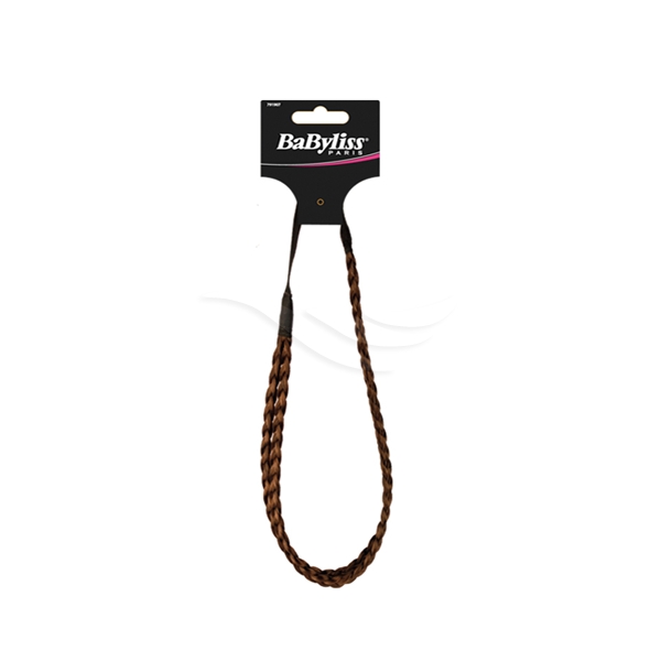 791908 Brown Double Braided Headband on tummanruskea hiuspanta tuplaletein BaBylissiltä. Letit ovat pituudeltaan 40 cm ja ne ovat kiinni 8 cm leveässä elastisessa pannassa joka pitää hiuspannan paikoillaan. Letit ovat noin 1 cm leveitä.