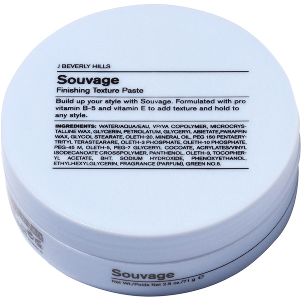 J. Beverly Hills Souvage - Finishing Texture Paste antaa hiuksillesi rakennetta ja hyvän tuen. Souvage sisältää B5- ja E-vitamiinia, jotka auttavat sinua muotoilemaan hiuksesi.