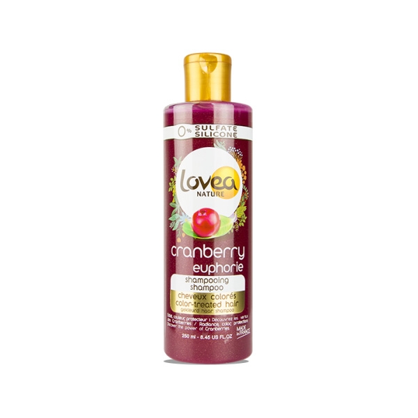 0% Cranberry Euphorie Shampoo - Color Treated Hair - Lovea on shampoo värjätyille hiuksille, ilman sulfaatteja, silikoneja ja parabeeneja. Se puhdistaa ja säilyttää laadun hiuskuidussa, kermainen vaahto sisältää antioksidanttia karpalouutetta, joka vahvistaa hiusväriä ilman, että hiukset tuntuvat raskailta.