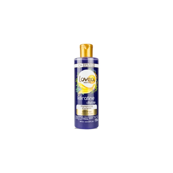 0% Kératine Divine Shampoo - Anti Frizz - Lovea on shampoo sähköisille ja jäykille hiuksille, ilman sulfaatteja, silikoneja ja parabeeneja. Se puhdistaa ja säilyttää laadun hiuskuidussa, kermainen vaahto sisältää siloittavaa kasvikeratiinia, auttaen taltuttamaan sähköiset ja jäykät hiukset.