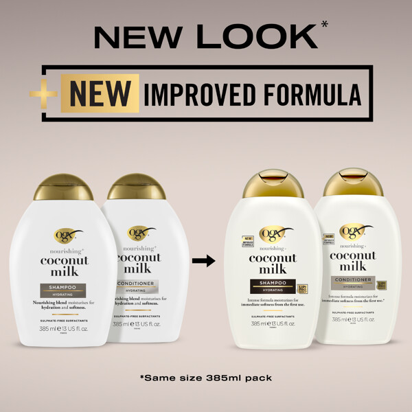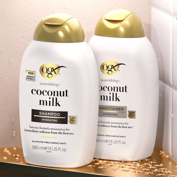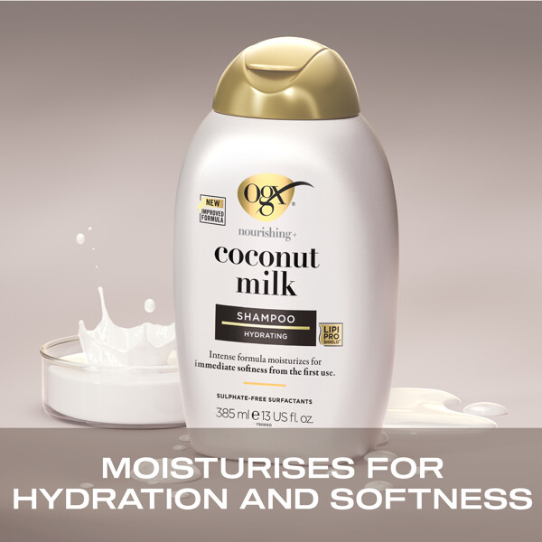 Coconut Milk Shampoo OGXlta on ihanan voidemainen yhdistelmä ravitsevaa kookosmaitoa, vahvistavaa munaproteiinia ja kosteuttavaa kookosöljyä. Hiuksista tulee pehmeät ja kiiltävät, tuoksuen miedosti kookokselle.