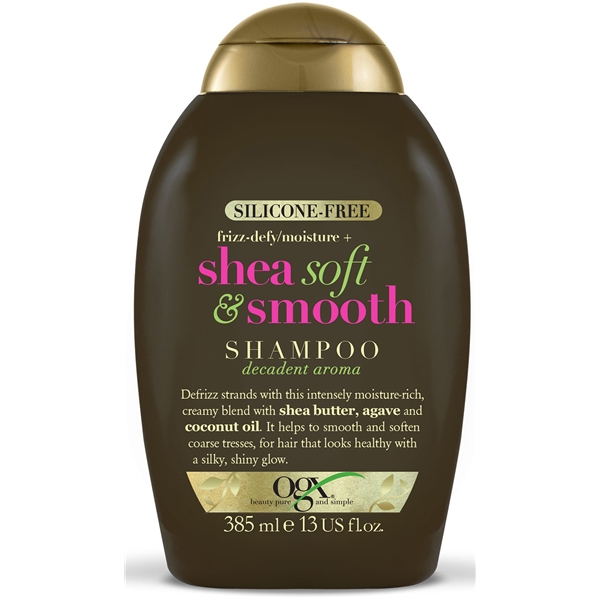 Ogx Shea Soft & Smooth Shampoo on shampoo poistaen pörröisyyttä sen sisältämän intensiivisesti kosteuttavan, voimemaisen koostumuksensa ansiosta, sisältäen sekoitusta sheavoita, agave-nektaria ja kookospähkinäöljyä. Auttaa siloittamaan ja pehmentämään hiuksia, saaden ne näyttämään terveiltä, silkinsileiltä ja kiiltäviltä. Silikoniton.