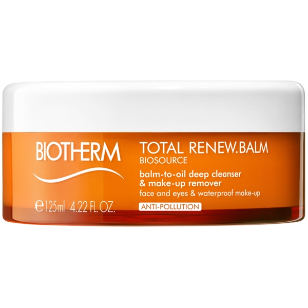 Biotherm Biosource Total Renew Balm-to-Oil Deep Cleanser & Makeup Remover on tehokas puhdistusvoide muuttuen miedoksi puhdistusöljyksi ja meikinpoistoaineeksi. Tehoaa myös vedenkestävälle meikille. Puhdistusvoide sisältää levää Life Plankton™,jota saadaan Ranskan kuumista lähteistä. Kaikille ihotyypeille.