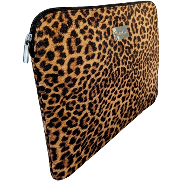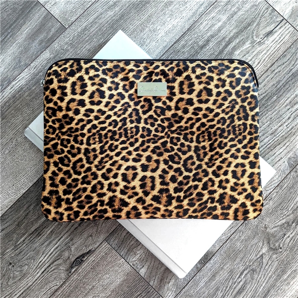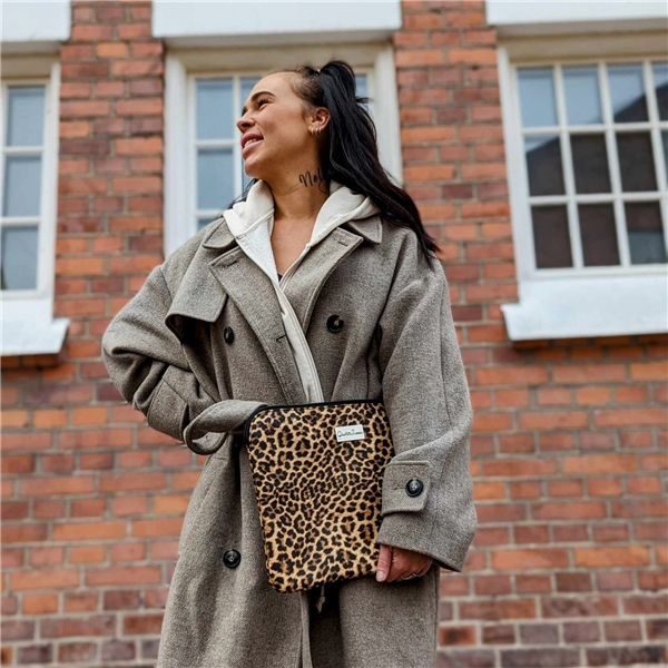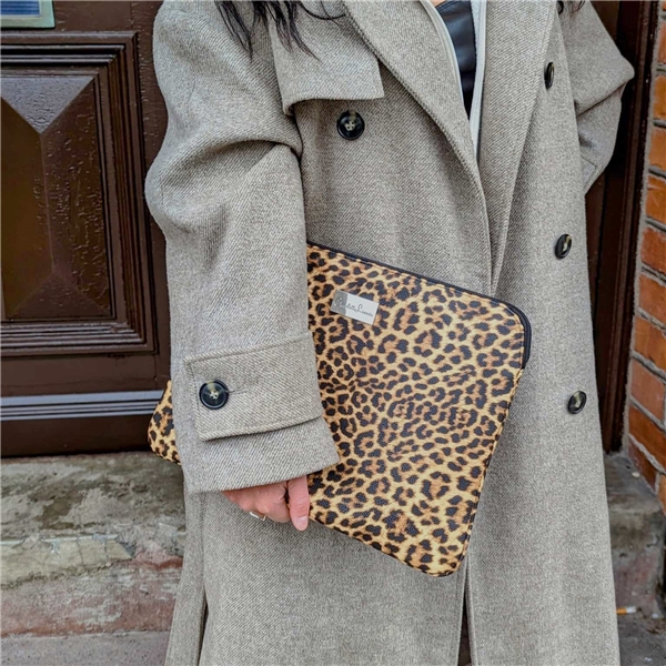 Materiaali kestävää vegaaninahkaa ruskealla tai mustalla leopardikuvioinnilla.