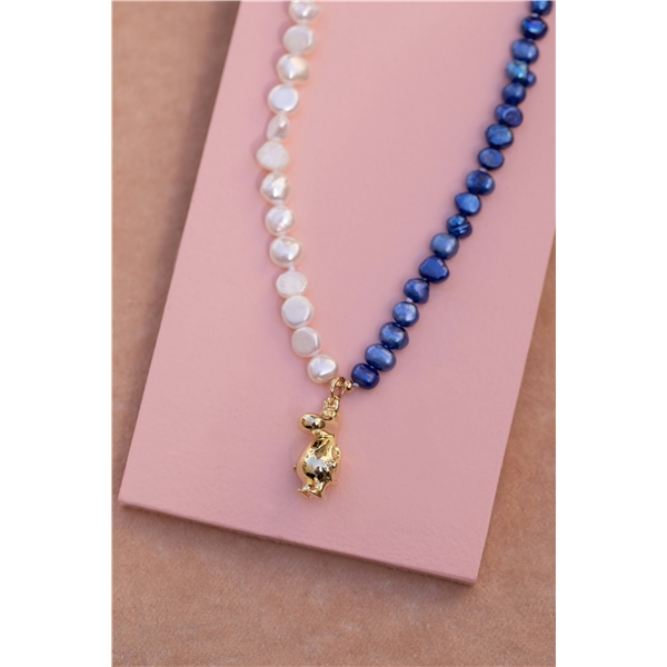 16608-07 Moomin Mixed Pearl Necklace on kaulakoru makeanveden helmillä ja 18K kullatulla Muumi-riipuksella. Puolikas korua on valkoisia helmiä ja toinen puoli syvän sinisiä helmiä. Valkoiset helmet ovat sinisiä suurempia.