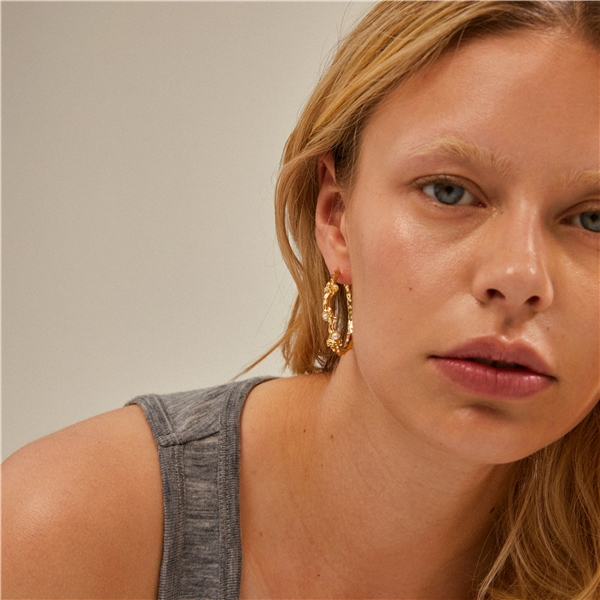 Luo oma tyylisi kullatuilla RAELYNN-korviksilla, joilla on persoonallinen ja leikkisä energia. Korvakorut ovat orgaanisesti muotoiltuja ja niissä on hienostunut käsintehty tunnelma, joissa on pieniä valkoisia helmiä luomassa kesäistä ja ylellistä tunnelmaa, jota voit helposti yhdistellä kauden vaaleisiin asuihin. Sekoita ja sovita erilaisia asusteita henkilökohtaiseen tyyliisi, joka saa sinut loistamaan. Korvakorut valmistettu vähintään 75 % kierrätysmateriaalista ympäristön huomioon ottaen. Mitat: 40 mm halkaisijaltaan
