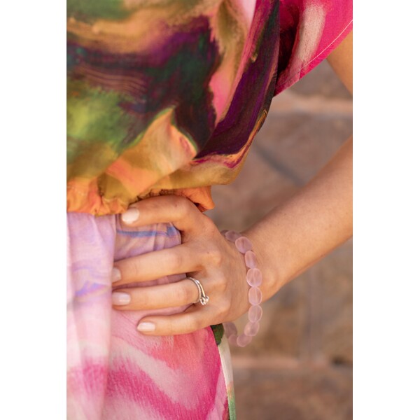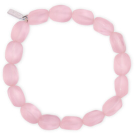 Joustava rannekoru, jossa on vaaleanpunaisia lasikiviä, jotka ovat mattahiottuja ja niillä on pehmeä pyöristetty epäsäännöllinen muoto.
