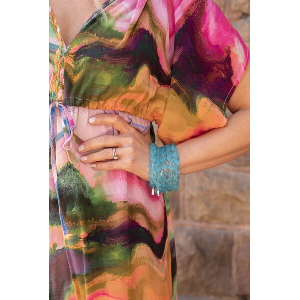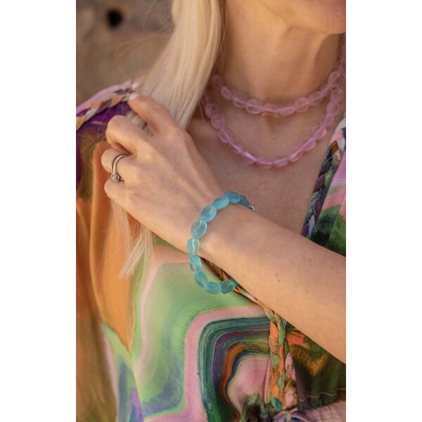 Joustava rannekoru, jossa on turkooseja lasikiviä, jotka ovat mattahiottuja ja niillä on pehmeä pyöristetty epäsäännöllinen muoto.