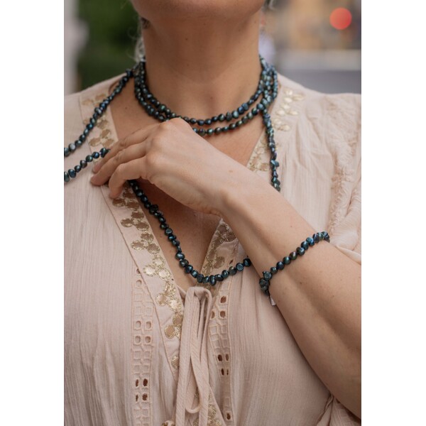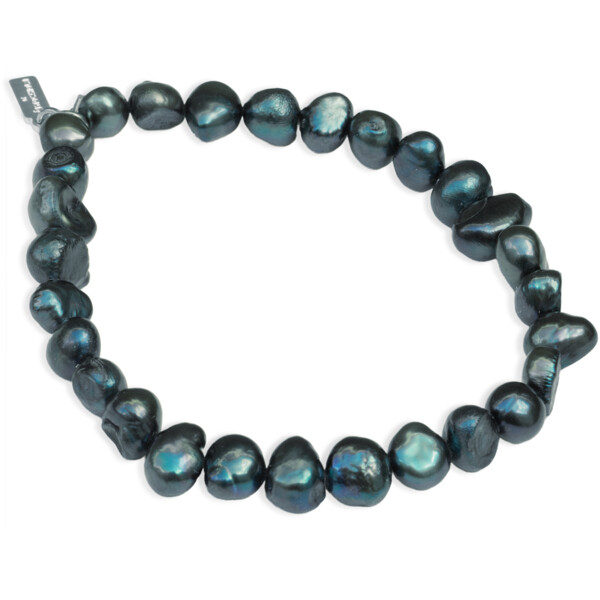 Tummanvihreä joustava helmikoru, jossa on aitoja makeanveden helmiä.