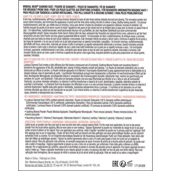 Mineral Wear® Diamond Dust Physicians Formulalta on korkealaatuinen puuteri, jossa on timanttikiiltoa ja joka antaa säteilevän vaikutuksen.