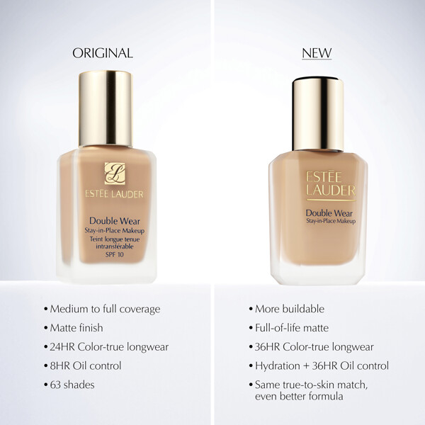 Antaa kauniin ja luonnollisen lopputuloksen, tasoittaa ihon sävyä, peittää epätasaisuudet ja tarjoaa kerrostettavan keskipeittävän tai täysin peittävän lopputuloksen. Saatavilla 60 sävyssä, joissa on kylmiä, neutraaleja ja lämpimiä pohjasävyjä. Double Wear -meikkivoide on vedenkestävä, joten se ei muuta väriä, tahraa eikä siirry vaatteisiin. Se antaa iholle runsaasti kosteutta ja väriä, joka kestää koko 24 tuntia - riippumatta stressistä ja aktiivisuustasosta.