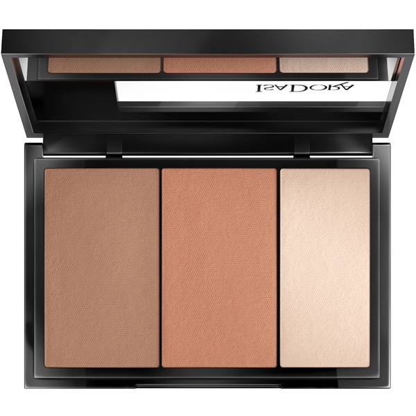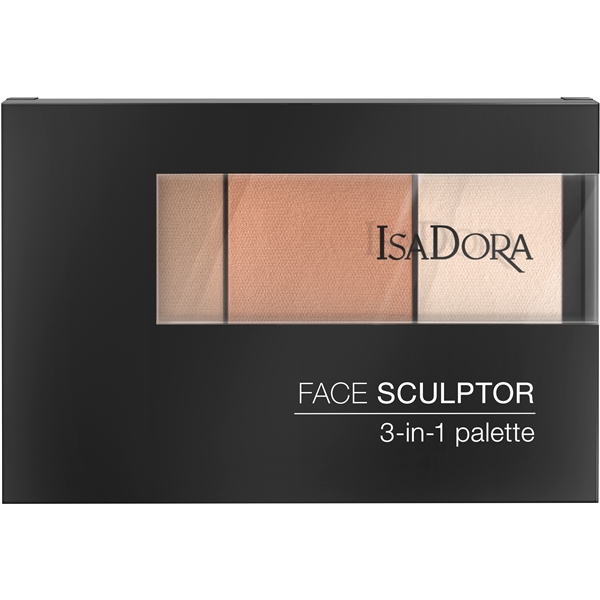 IsaDora Face Sculptor 3in1 Palette on käytännöllinen, monitoiminnallinen 3-in-1 paletti sisältäen aurinkopuuterin, poskipunan ja highlighterin.