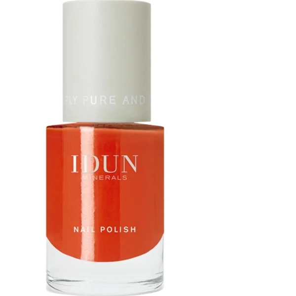 IDUN Nail Polish sisältää laadukkaita ainesosia ja siinä on pitkäkestoinen koostumus antaen upean kiillon. Kynsilakassa on nk. 5-free formula, tarkoittaen että siitä on poistettu 5 terveydelle haitallista kemikaalia. Lisäksi se sisältää ainesosia, jotka hoitavat kynsiä.