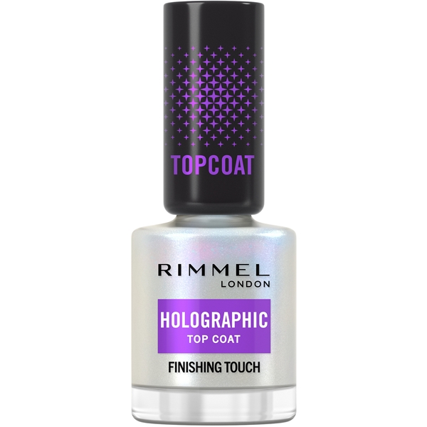 Rimmel Holographic Top Coat antaa upean tehon suosikkikynsilakkaasi helmiäiskimalluksella ja holografisella päällyslakalla täydellistä manikyyriä varten. Muuttaa kynnet päivästä yöksi ja antaa kestävän manikyyrin useiksi päiviksi.