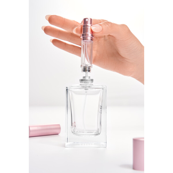 Poista suihkepää suosikkihajuvedestäsi ja aseta atomisaattorin pohja hajuveden suuttimen päälle. Pumppaa ylös ja alas, kunnes pullo on täynnä. Laita sitten korkki paikoilleen – nyt atomisaattorisi on valmis käytettäväksi. Suihkuta, kun haluat raikastaa itseäsi tunnusomaisella tuoksullasi!