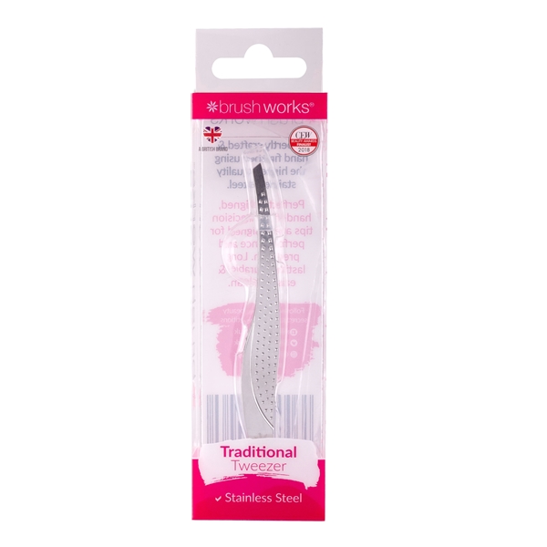 Brushworks Traditional Tweezers on valmistettu kulutusta kestävästä ruostumattomasta teräksestä. Niissä on viistoon leikattu kärki ja taivutettu muoto, joka mahdollistaa tukevan ja mukavan otteen käytössä antaen parhaan mahdollisen tuloksen.