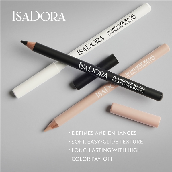 IsaDora The Inliner Kajal on pehmeä, pigmenttirikas eyeliner suunniteltu vesirajalle. Inliner Kajalilla on pehmeä koostumus, joka liukuu helposti vesirajalle yhdellä vedolla. Koostumus on kehitetty erityisesti tätä tarkoitusta varten ja antaa kestävän tuloksen ärsyttämättä silmiä. Siinä on korkea pigmenttipitoisuus ja se antaa välittömästi määritellyt silmät, mutta sitä voidaan käyttää myös perinteisenä eyelinerina klassisen siiven tai muun cool liner -lookin luomiseen. Sisältää matalan sulamispisteen vahoja, jotka tarttuvat hyvin ihoon antaen erittäin kestävän tuloksen. - Määrittelee ja korostaa silmiä - Pehmeä, helposti levittyvä - Kestävä, korkea pigmenttipitoisuus CRUELTY FREE OFTALMOLOGISESTI TESTATTU HAJUSTAMATON VEGAANIYSTÄVÄLLINEN