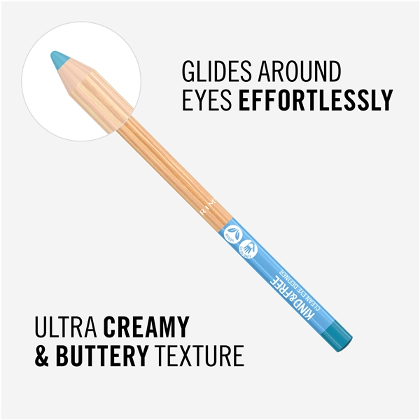 Rimmel Kind & Free Clean Eyeliner on eyeliner, jossa on täyteläinen väri ja se rajaa ja korostaa silmiäsi välittömästi. Tässä eyelinerissa on kevyt ja voidemainen koostumus, minkä ansiosta se liukuu kevyesti iholla.