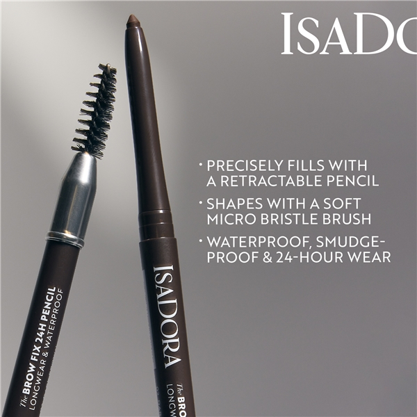 IsaDora The Brow Fix 24h Pencil Longwear on vedenkestävä, tahraamaton kulmakynä, joka täyttää ja muotoilee kulmakarvat 24 tunnin kestolla.