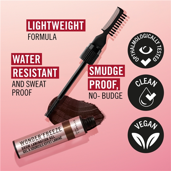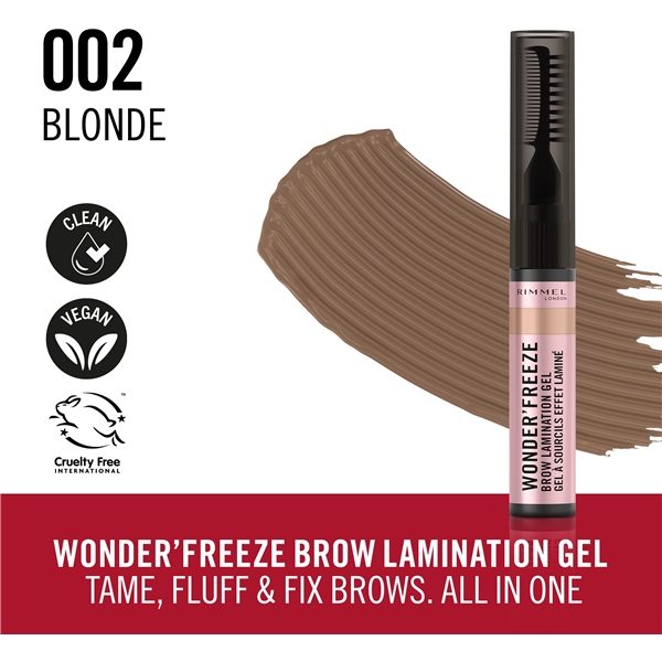 Rimmel Wonder Freeze - Brow Lamination Gel on kaikki-yhdessä-ratkaisu kulmakarvojen kesyttämiseen, pörröisyyden lisäämiseen ja kiinnittämiseen niin, että ne pysyvät koko päivän.