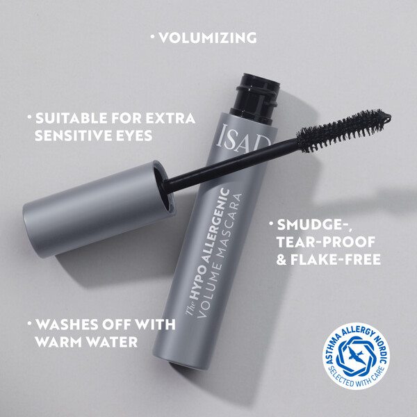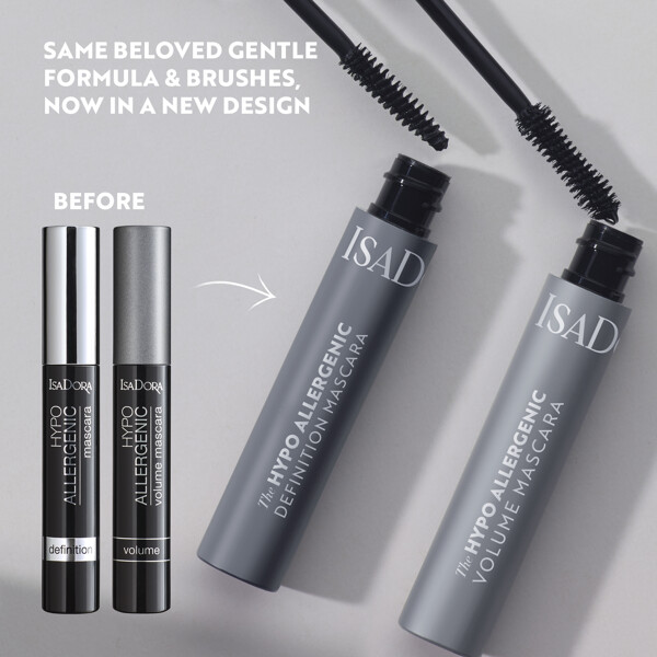 IsaDora Hypo Allergenic Mascaranyt uutena tuuheuttavana versiona: IsaDora Hypo Allergenic Volume Mascara. Siinä on sama hypoallergeeninen koostumus, mutta uusi tuuhettava harja.