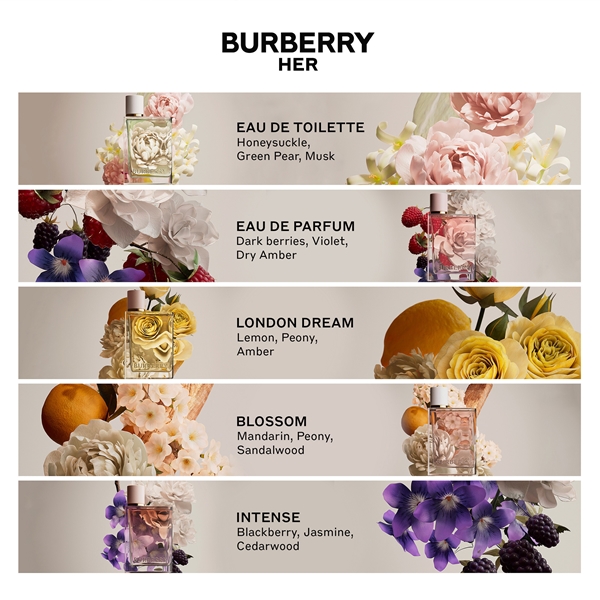 Burberry Her Eau de toilettessa on kupliva sekoitus pionia, mehukasta päärynää, mustaa viinimarjaa ja roseepippuria. Tätä hedelmäistä kukkaistuoksua kohottavat kuusama, kielo ja ruusu ja se pyöristyy pehmeästi hypnoottiseen myskiin ja setripuuhun.