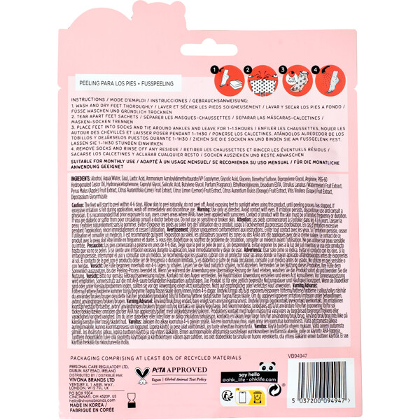 Oh K! Watermelon Jelly Foot Peel on kuoriva jalkanaamio, joka sisältää hedelmähappoja (AHA:t & BHA:t), jotka kuorivat ihoa hellävaraisesti ja poistavat kuolleita ihosoluja.