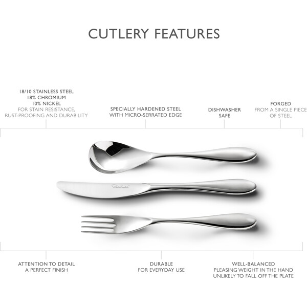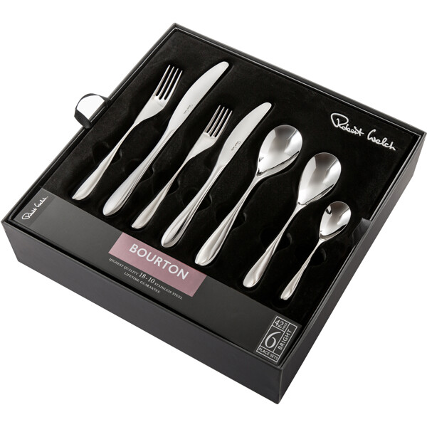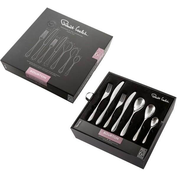 Bourton-aterinsarja, 42 osaa, Robert Welchiltä, sai inspiraationsa Bourton on the Waterin viehättävän kylän läpi virtaavasta mutkittelevasta joesta. Pehmeän ja elegantin profiilinsa ansiosta aterinsarjasta tulee nopeasti suosikki. Lusikat ja haarukat on valmistettu korkealaatuisesta 18/10 ruostumattomasta teräksestä. Veitsenterät on valmistettu erityisesti karkaistusta ruostumattomasta teräksestä parhaan mahdollisen leikkuureunan saavuttamiseksi.