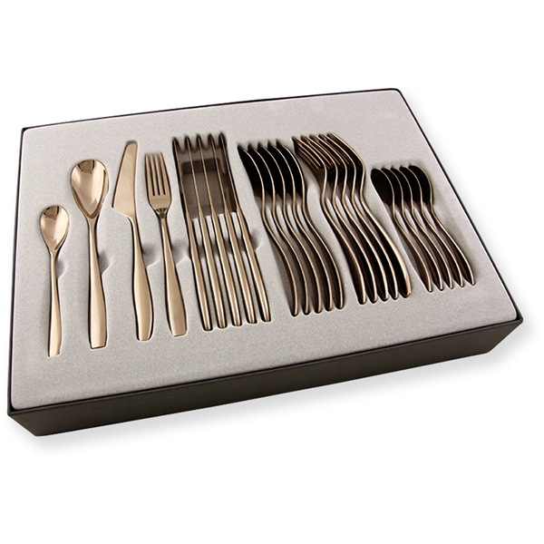 24 osaa sisältää seuraavat 6 hengelle: ruokahaarukka, ruokaveitsi, ruokalusikka ja jälkiruokalusikka.
