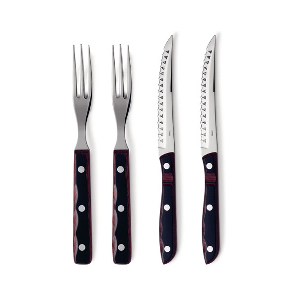 Suosittu ja reilun kokoinen aterin. Suunnittelijana Bent Severin. Materiaali: 18/8 Rruostumaton teräs ja ruusupuu. Veitsen terä soveltuu erityisen hyvin pihvien tai grillatun lihan leikkaamiseen, mutta sitä voidaan käyttää tietysti muissakin tilaisuuksissa. Tämä setti sisältää 2 veistä ja 2 haarukkaa jotka ovat pakattuna mukavaan puiseen laatikkoon.