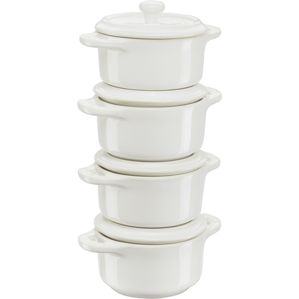 STAUB Mini cocotte -setti sopii täydellisesti alkuruokien, napostelupalojen ja jälkiruokien tarjoiluun. Kestää sekä uunin että mikroaaltouunin, se on pakkasenkestävä ja voidaan pestä astianpesukoneessa. Toimitetaan 4 kappaleen settinä.
