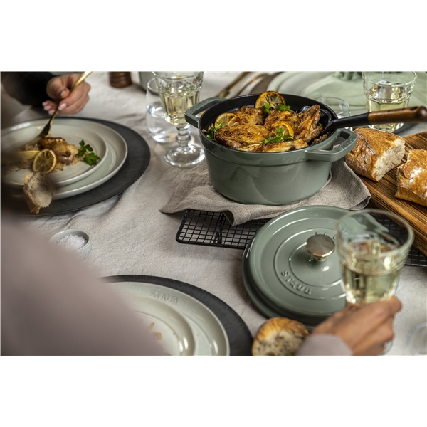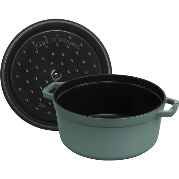 Pyöreässä, perinteisessä ranskalaisessa padassa voi valmistaa monia pataruokia ja herkullisia muhennoksia. Sen halkaisija on 26 cm, korkeus 17 cm ja tilavuus 5,2 litraa. Pata on riittävän suuri, jotta voit valmistaa ruokaa monille vieraille. Sen kauniin muotoilun ansiosta voit asettaa sen pöydälle illallisella ystävien tai sukulaisten kanssa. Se myös pitää ruoan lämpimänä pidempään. Staubin musta kattila on valmistettu valuraudasta. Tämä vankka ja kestävä materiaali varastoi lämpöä erittäin hyvin ja jakaa sen tasaisesti koko pohjalle. Näin liha, vihannekset ja muut ainekset kypsyvät hellävaraisesti ja arvokkaat ravintoaineet säilyvät. Padan sisäpuolella on musta emalipinnoite. Tämä pinnoite tehostaa haudutusta ja säilyttää näin raaka-aineiden luonnollisen maun. Lisäksi tällainen pata paranee lisää, mitä useammin sitä käytetään. Staubin kattila sopii kaikenlaiseen ruoanlaittoon, myös induktioliedelle. Se on yhtä suosittu niin amatöörikokkien kuin ammattilaistenkin keskuudessa, ja jopa tunnetut julkkiskokit käyttävät sitä uusiin, hienostuneisiin resepteihin. Tämän laadukkaan mutta helppohoitoisen padan avulla sinäkin voit loihtia herkullisimmat ruoat helposti.