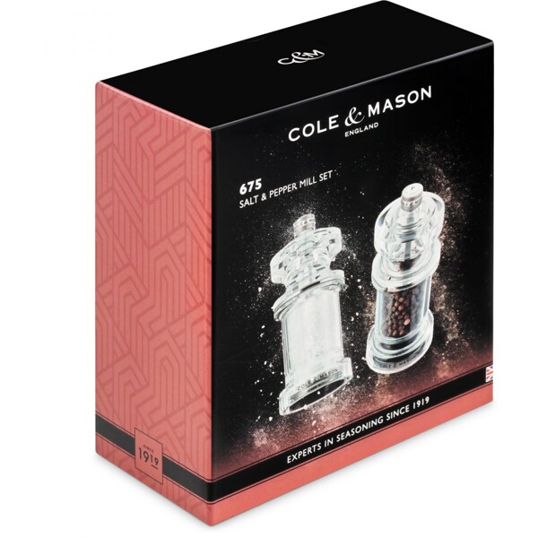 Vuonna 1975 Cole and Mason lanseerasi maailman ensimmäisen akryylimyllyn, ikonisen 505-mallimme. Julian Cowanin pojan, David Cowanin, keksimä malli on osoittautunut suosituksi ja ajattomaksi klassikoksi, joka on edelleen valikoimassamme tänä päivänä. Uudet 605- ja 675-myllyt saavat inspiraationsa ikonisista vastineistaan, kun taas reunojen leikkaus, uusi nuppi ja ruostumattomasta teräksestä valmistetun kauluksen lisäys antavat modernin ja ensiluokkaisen tunteen. Kaikissa pippurimyllyissä on Cole and Mason Precision -hiiliteräsmekanismi ja ne kuuluvat elinikäisen takuumme piiriin. Suolamyllyissä on kaikki varustettu korkealaatuisella ruostesuojatulla keraamisella mekanismillamme.