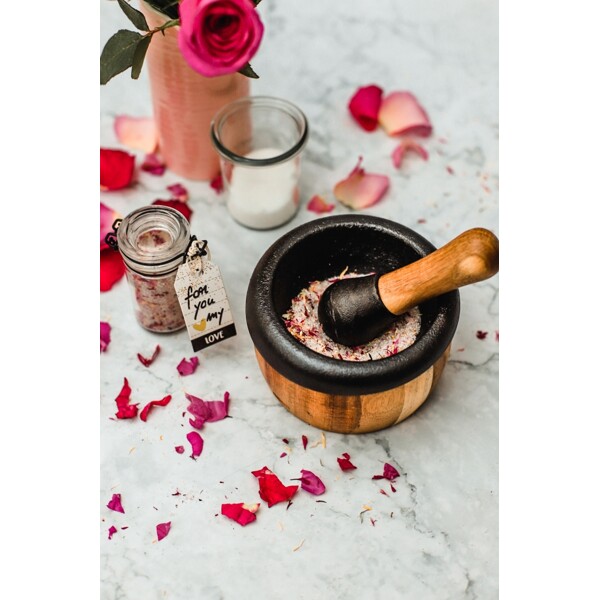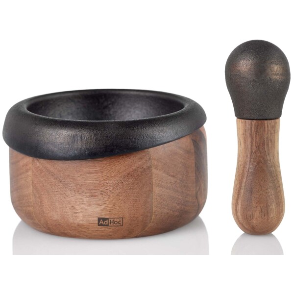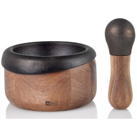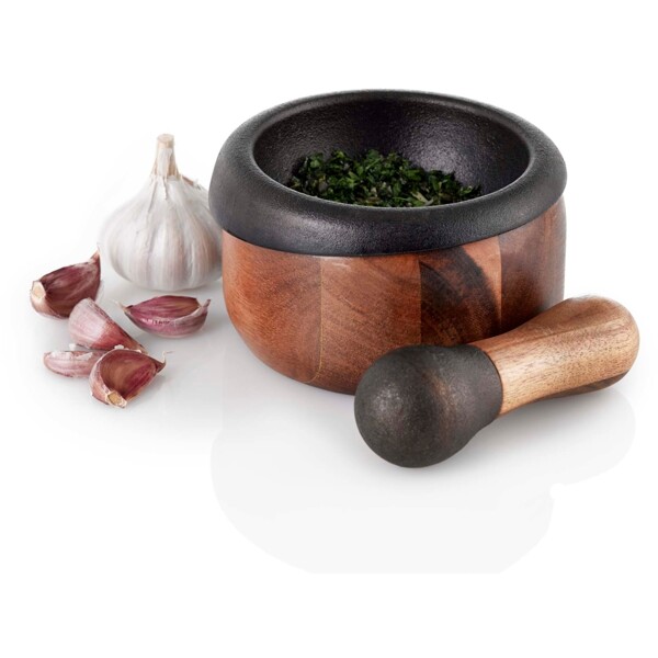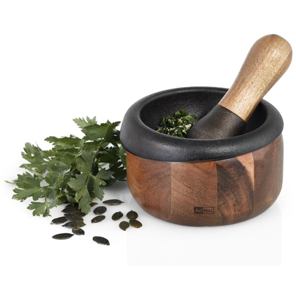 Korkealaatuinen mortteli perinteiseen valmistukseen. Murskaa, jauha ja nuiji helposti. Hiomapinnat ovat korkealaatuista valurautaa ja kahva akaasiapuuta.