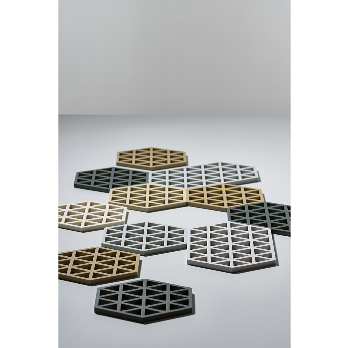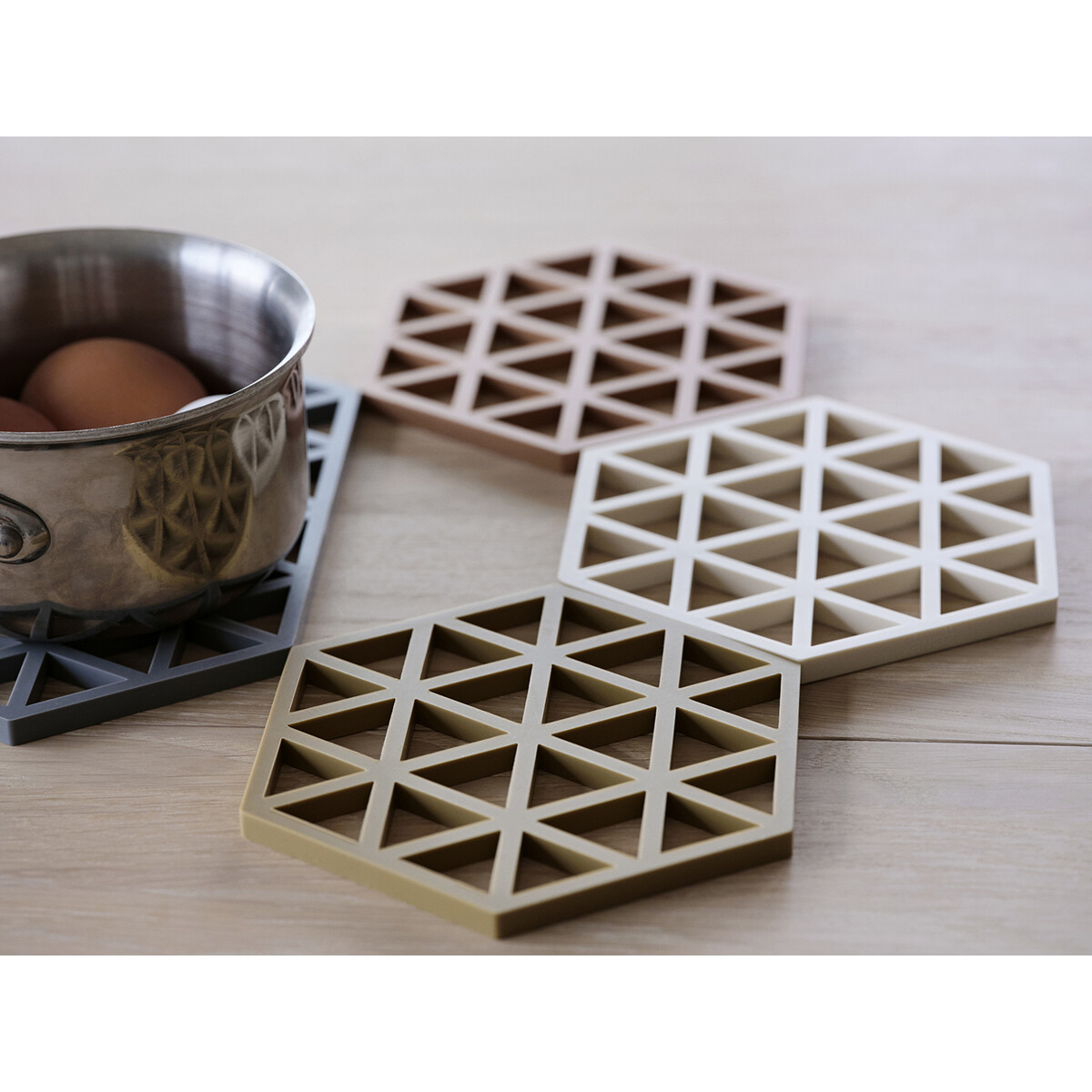 Sarjan on luonut suunnittelijakolmikko VE2. Triangles on saatavana monissa jännittävissä väreissä ja se on täydellinen yhdistettäväksi Hexagon-pannunalusten kanssa, joilla on samat ulkomitat.