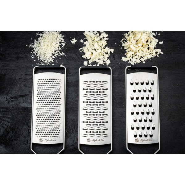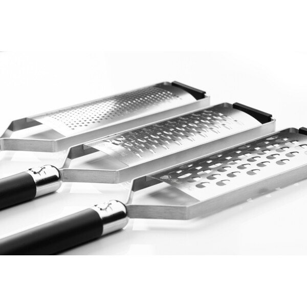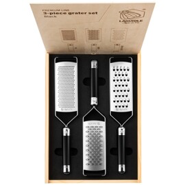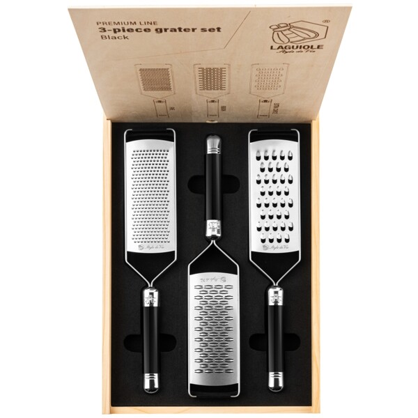 Kolmen osan sarja Laguiole Style de Vie -merkiltä. Jokaisella raastimella on oma tehtävänsä, mikä tekee tästä sarjasta erittäin monipuolisen. Hienoa raastinta käytetään esimerkiksi sitrushedelmille, suklaalle, koville juustoille ja mausteille, kun taas erittäin karkeaa raastinta sopii parhaiten perunoille, kaalille, kurkulle, kurpitsalle, juustolle, makkaralle ja omenalle. Nauhamalli on ihanteellinen mausteiden, sitrushedelmien, juuston, inkiväärin, kookoksen ja suklaan raastamiseen. Kaikissa kolmessa raastimessa on laserleikattu teräspinta ruostumattomasta teräksestä. Raastimet leikataan lasertekniikalla, mikä varmistaa, että raastimet ovat erittäin teräviä. Rikkaista kulinaarista repertuaariasi tällä erittäin toiminnallisella kolmen osan raastinsarjalla! Täydellisyys alkaa oikeiden työkalujen käytöstä! Pakattu tyylikkääseen puulaatikkoon, mikä tekee tästä sarjasta myös erinomaisen lahjan.