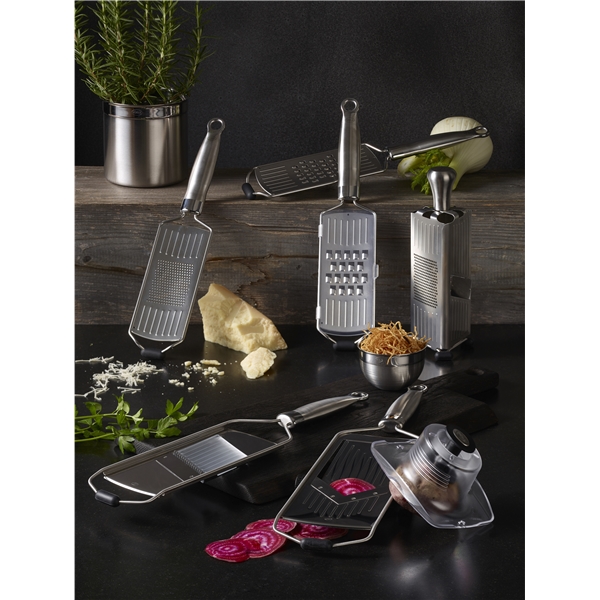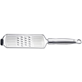 Rösle raastin kahvalla, valmistettu yksinomaan ruostumattomasta teräksestä. Ergonomisesti muotoiltu kahva pysyy tukevasti kädessä ja siinä on lisäksi käytännöllinen ripustuskoukku. Täydellinen kovalle juustolle, esimerkiksi parmesaanille täydellistä pastaruokaa varten, mausteille, suklaalle tai inkiväärille leivonnassa. Raastimen erikoismuotoillut hampaat mahdollistavat nopean raastamisen vähäisellä vaivalla. Saatavilla eri malleina.