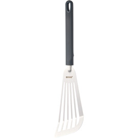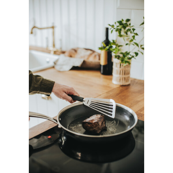 Tämä 33 cm:n paistinlasta yhdistää toiminnallisuuden ja hellävaraisen käsittelyn. Silikonipäällysteinen kärki suojaa tarttumattomia pannujasi ja herkkiä keittoastioitasi naarmuilta, samalla kun se tarjoaa tehokkaan ja sujuvan käytön. Täydellinen pannukakkujen, munakkaiden tai herkullisten ruokien, kuten kalan ja vihannesten, kääntämiseen. Pituudeltaan 33 cm se on ihanteellinen sekä ruoanlaittoon että tarjoiluun. Ergonominen kahva tarjoaa mukavan otteen, mikä tekee siitä helppokäyttöisen myös pitkien keittiösessioiden aikana.