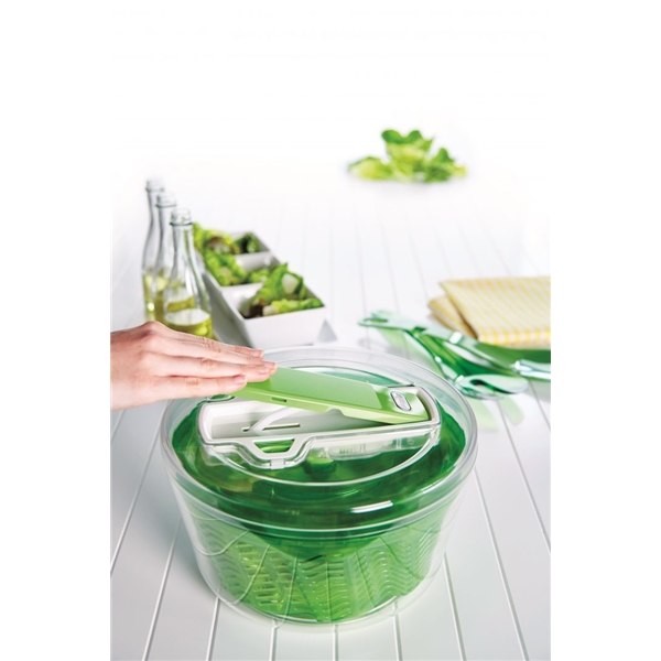 Salaatin peseminen ja kuivaaminen on vaikeaa tehdä koskematta, vaikka sinulla olisi siivilä. Salaatti voi usein jäädä makaamaan vesilätäkköön lautasellasi, Zyliss Swift Dry Salad Spinner tekee märästä salaatista menneisyyttä. Ainutlaatuisella muotoillulla korilla on suurempi pinta-ala, mikä auttaa poistamaan veden nopeasti. Käytä kulhoa liukumattomalla pohjalla tarjoillaksesi salaattisi pöydässä.