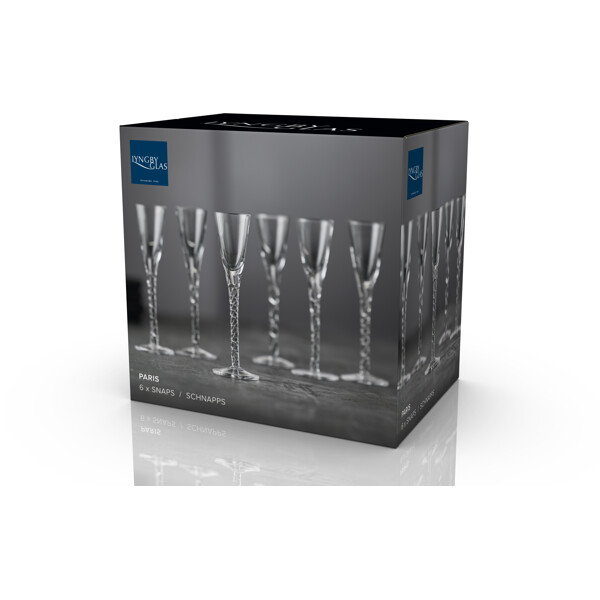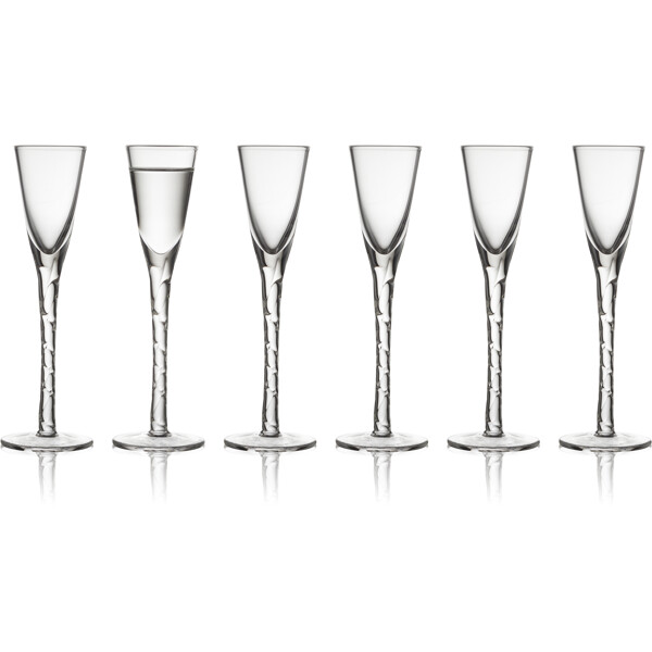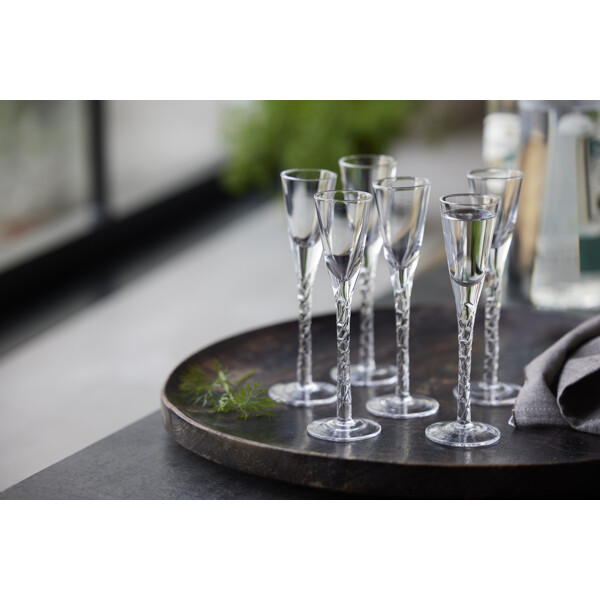 6 kpl käsintehtyjä ja suupuhallettuja snapsilaseja, joissa on käsin kiertynyt varsi ja jotka luovat hyvää tunnelmaa pöydän ympärille. Kirkkaasta lasista valmistetuilla snapsilaseilla on elegantti, klassinen muotoilu ja ne vetävät 2,5 cl. Korkeus 16 cm.