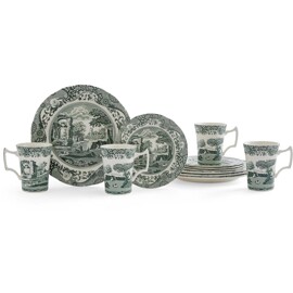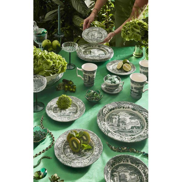 Heritage Green Italian 12-osainen setti on kaunis johdanto yhteen Spoden rakastetuimmista astiastomalleista – nyt syvänvihreänä tulkintana klassisesta Blue Italian -kuviosta. Setti sisältää neljä ruokalautasta, neljä pienempää lautasta ja neljä mukia – kaikki Spoden korkealaatuista posliinia tunnetuilla muodoilla ja koristeilla.Kuvitukset ovat saaneet inspiraationsa viehättävästä italialaisesta maaseudusta, ja niitä kehystää elegantti 1700-luvun Imari Oriental -kuvio, joka kulkee reunojen pitkin. Setti sopii yhtä hyvin arkiaterioille kuin hienompiin kattauksiin, ja se on erinomainen valinta niille, jotka haluavat aloittaa tämän ikonisen sarjan keräämisen.Valmistettu Stoke-on-Trentissä, Englannissa – brittiläisen posliiniperinteen keskus 1700-luvulta lähtien.Sisältö & mitat:4 × Lautanen Ø27 cm – korkeus 2 cm 4 × Lautanen Ø20 cm – korkeus 2 cm 4 × Muki 0,28 L