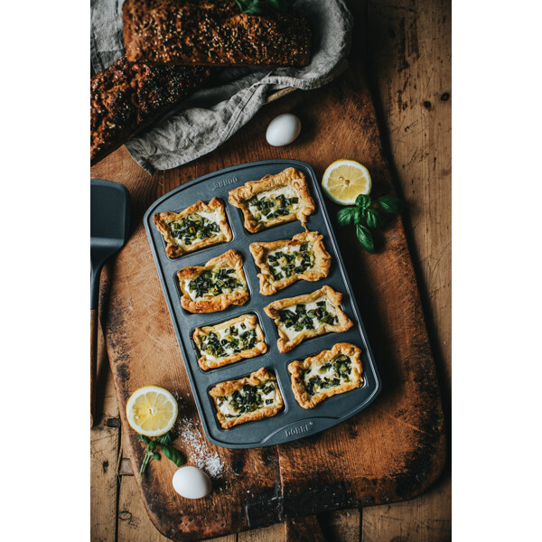 Käytännöllinen uunipelti, johon mahtuu 8 annosvuokaa, täydellinen leivälle, kakkuille ja jälkiruoille. Valmistettu kestävästä hiiliteräksestä, ei sisällä PTFE:tä, PFOA:ta eikä BPA:ta. Tarjoaa tasaisen paistotuloksen ja on helppo puhdistaa – täydellinen sekä arkipäivän leivontaan että juhlatilaisuuksiin.