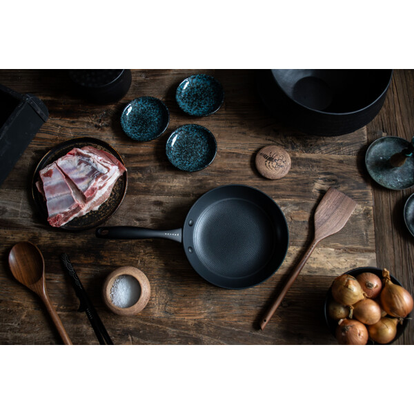 Toinen uutuus on mattamustat kahvat ja yksityiskohdat. Ehkä maailman tyylikkäin paistinpannu? Hunajakennokuvioitu pinta jakaa lämmön tasaisesti ja antaa täydellisen pinnan raaka-aineille. Erinomainen pannu kaikenlaiseen paistamiseen – vihanneksille, kalalle ja lihalle.