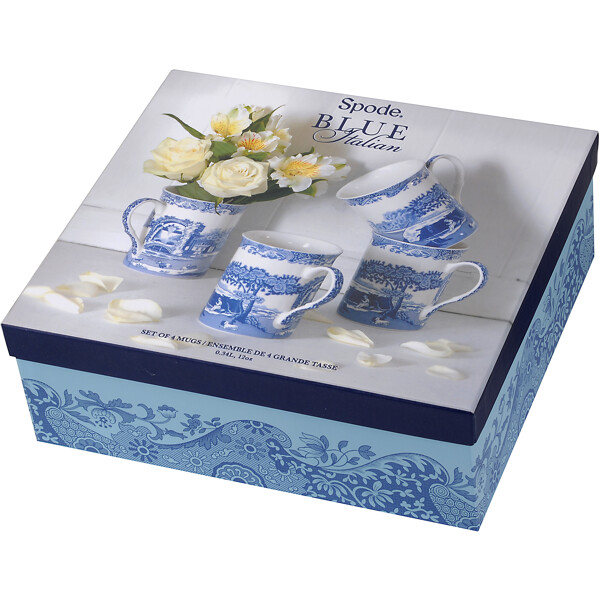 Neljän mukin lahjapakkaus Spoden erittäin kauniista Blue Italian -kokoelmasta. Se on ollut vuodesta 1816 tunnettu siitä, että se tuo koteihin ja talouksiin ympäri maailmaa viehätystä ja ajattoman tyylin. Nyt, yli 200 vuotta myöhemmin, Blue Italian -posliinilla on todellinen paikka ihmisten sydämissä, ja astiastot löytyvät usein keskipisteestä erityisissä perhejuhlissa, tyylikkäissä illallisjuhlissa tai koristeellisesti ripustettuina elegantteina sisustuselementteinä. Spode on englantilainen posliinimerkki, jota valmistaa samanniminen yritys ja joka sijaitsee Stoke-on-Trentissä, Englannissa. Yritys perustettiin vuonna 1770 Josiah Spoden toimesta, ja se on nykyään yksi tunnetuimmista posliinimerkeistä, jonka tunnistettavat kokoelmat löytyvät talouksista ympäri maailmaa.