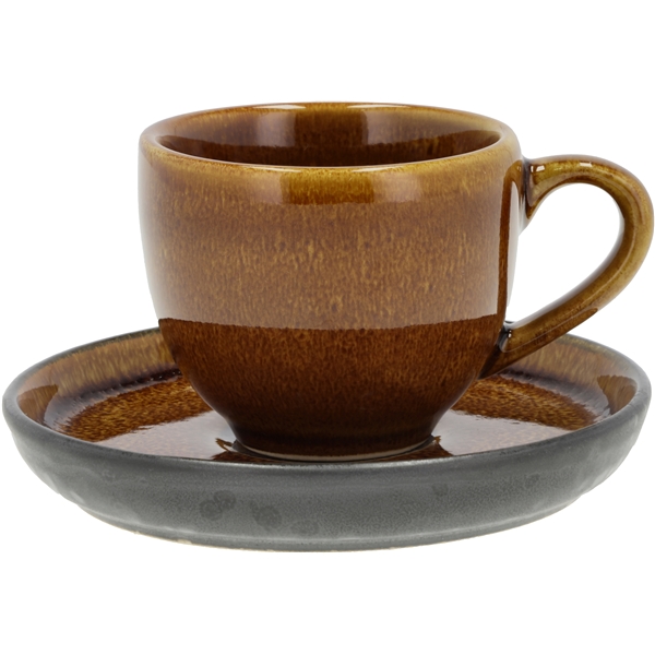 Hieno espressokuppi korvalla ja siihen yhteensopiva asetti rustiikkisesta kivikeramiikasta. Asetin alapuolen pinnassa on mattainen, musta lasitus, yläpinnassa on sama kiiltävä ja värjätty lasitus kuin kupin ulko- ja sisäpinnassa. Tilavuus 7 cl. Halkaisija. 5,5 x 5 cm. Kivitavara kestää konepesun, mikroaaltouunin ja uunin 220 lämpötilaan asti.